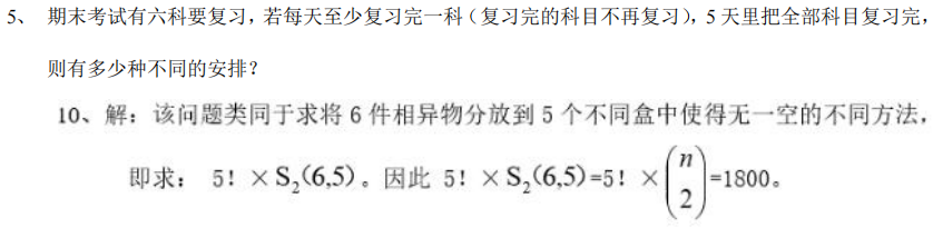 - 第二类Stirling数(\(n\)元集合的\(r\)-划分数,\(n\)个不同的球放入\(r\)个相同的盒):\(S(n,r)=\frac{1}{r!}\sum\limits_{i=0}^{r}(-1)^{i}\begin{pmatrix}r\\i\end{pmatrix}(r-i)^{n}\)