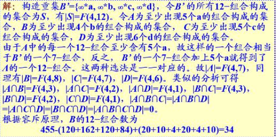 求重集\(B=\{4\cdot a,3\cdot b,4\cdot c,5\cdot d\}\)的\(r\)-组合数,其中\(r=12\)