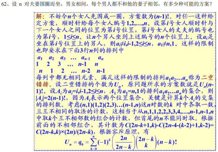 此外要求男女相间,否则答案是\(\sum\limits_{k=0}^n(-1)^kC_n^k2^k(2n-k-1)!\)
