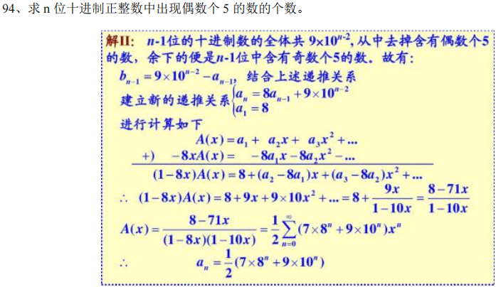 如果递推公式中统一\(a\)的下标和\(x\)的次数,则应该这样推:\[\begin{align*} (1-8x)A(x)&=a_1x+\sum\limits_{k=2}^\infty\left(a_k-8a_{k-1}\right)x^k\\ (1-8x)A(x)&=8x+\sum\limits_{k=2}^\infty\left(9\times10^{k-2}\right)x^k\\ A(x)&=\frac{1}{2}\sum\limits_{k=1}^\infty\left(7\times8^{n-1}+9\times10^{n-1}\right)x^n \end{align*} \]另外,递推公式的\(a_n=8a_{n-1}+9\times10^{n-2}\)应该这样理解: