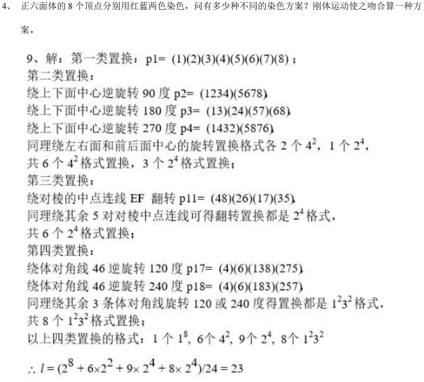 - 写出置换集\(G\)的循环指数\(P_G(z_{1},z_{2},\cdots,z_{n})=\frac{1}{|G|}\sum\limits_{f\in G}z_{1}^{e_{1}}z_{2}^{e_{2}}\cdots z_{n}^{e_{n}}\)