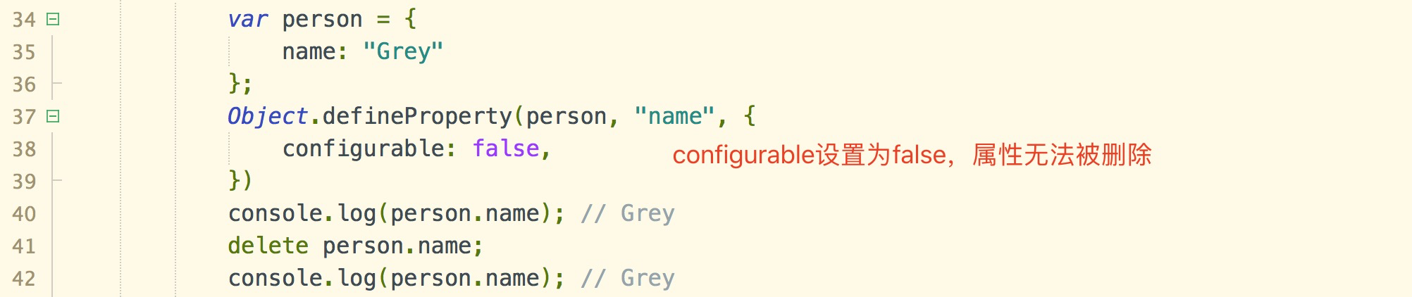 [[Configurable]] (可配置) : 表示能否通过delete删除属性从而重新定义属性,能否修改属性的特性,或者能否把属性修改为访问器属性。默认值为true。