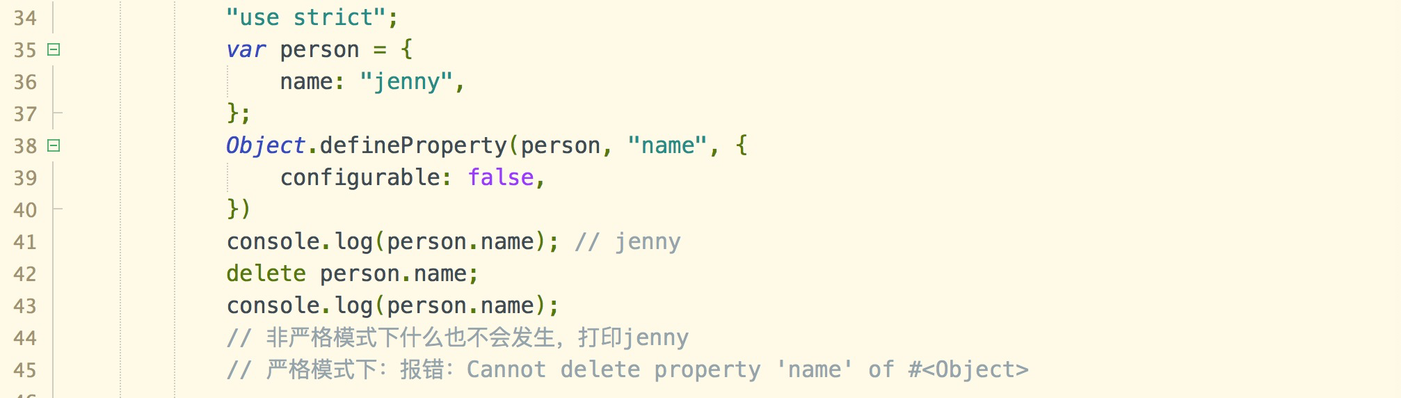 结论:可以Object.definedProperty()方法修改同一个属性,但在把configurable特性设置为false之后会有限制(在非严格模式下什么也不会发生,严格模式下会导致错误)。