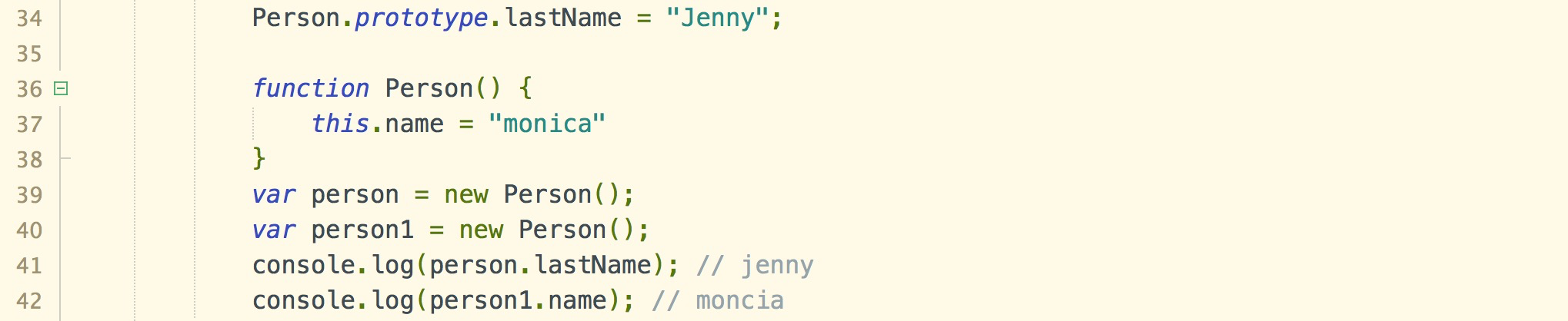下面代码在原型上定义了一个lasName属性,构造函数自身自带name属性,那么通过该构造函数创建的示例对象既可以访问构造函数自身内部的属性,也可以访问原型上的属性