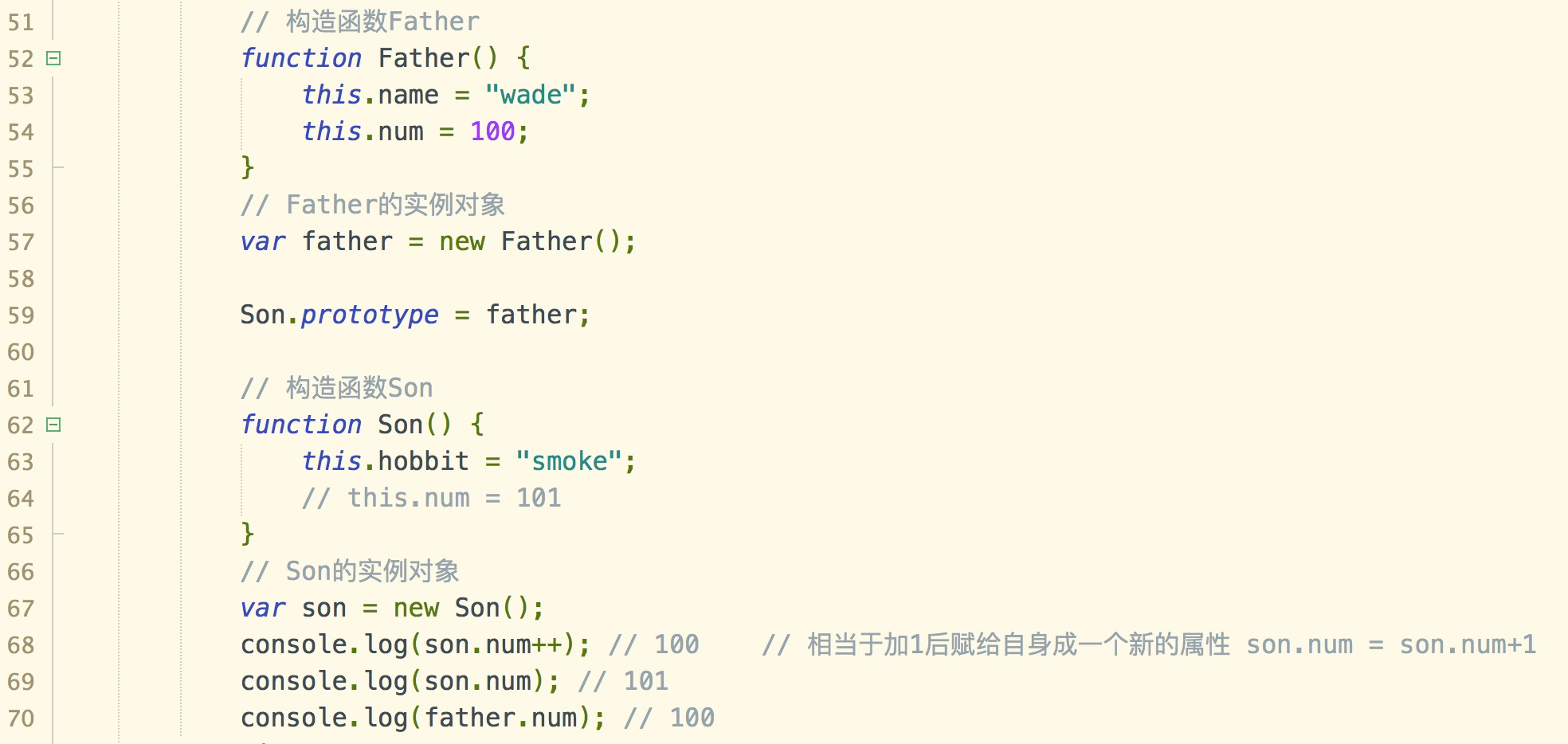 // 组合继承 function Super(name) { this.name = name; this.colors = ["red", "blue", "green"]; } Super.prototype.sayName = function() { console.log(this.name); } function Sub(name, age) { // 继承属性 Super.call(this, name); this.age = age; } // 继承方法 Sub.prototype = new Super(); Sub.prototype.sayAge = function() { console.log(this.age); } var instance = new Sub("james", 36); console.log(instance instanceof Sub); // true console.log(instance instanceof Super); // true console.log(instance instanceof Object); // true console.log(Object.prototype.isPrototypeOf(instance)); // true console.log(Super.prototype.isPrototypeOf(instance)); // true console.log(Sub.prototype.isPrototypeOf(instance)); // true