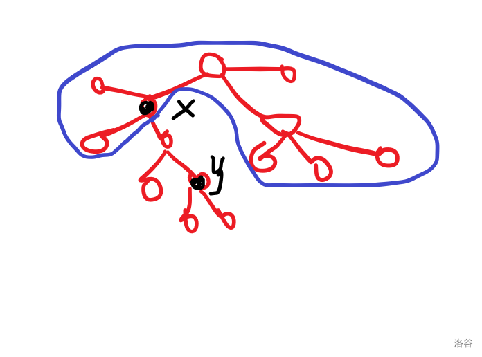 接下来考虑一下限制,先假设只有一条限制,我们默认以一为跟,若 \(x\) 比 \(y\) 先离开且为 \(y\) 的祖先,则一定不会是最后一个的点如下: