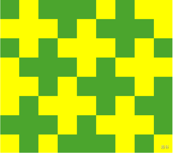 我们钦定 # 为陆地,. 为障碍,那么如果棋盘无限大且全是陆地的话,我们是可以通过构造使得每一个十字架(不妨这么称呼)都恰好覆盖 \(5\) 个陆地,那么一定是可行的,然后可以给十字架染色,注意到只需要两种颜色就可以区分,如下图所示: