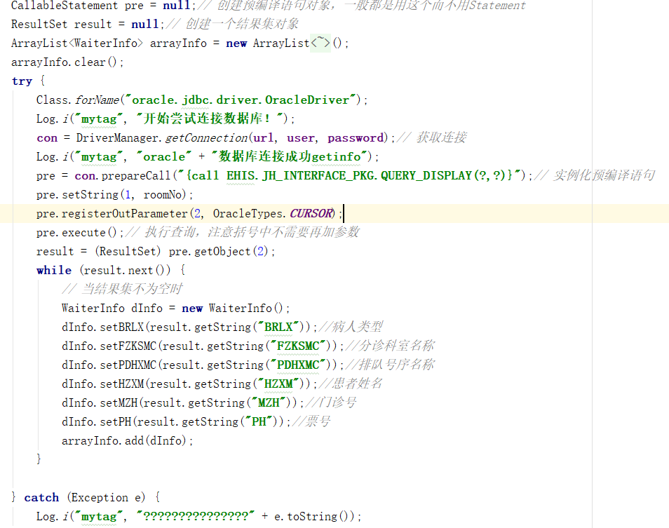 package pojo; import oracle.jdbc.OracleTypes; import java.sql.*; import java.util.ArrayList; public class JdbcProcedureTest { public static void main(String[] args) throws ClassNotFoundException, SQLException { ArrayList<ClinicJhlish> list=new ArrayList<ClinicJhlish>(); String driver = "oracle.jdbc.driver.OracleDriver"; /*String url = "jdbc:mysql://127.0.0.1:3306/ump?useUnicode=true&characterEncoding=utf8&autoReconnect=true&rewriteBatchedStatements=TRUE";*/ String url = "jdbc:oracle:thin:@//192.168.6.240:1521/hissdbs"; String user = "Oracle"; String password = "root123"; Class.forName(driver); Connection conn = DriverManager.getConnection(url, user, password); String sql = "{call EHIS.JH_INTERFACE_PKG.QUERY_CLINICJHLIST(?,?)}";/*EHIS.JH_INTERFACE_PKG 包名*/ CallableStatement stmt = conn.prepareCall(sql);//jdbc执行过程//调用格式 {call 存储过程名(参数)} stmt.setObject(1,1);//索引1,第1个id LED类型 /*stmt.setObject(3, "3");*/ /*stmt.registerOutParameter(1, Types.VARCHAR);*/ /*返回类型例子 stmt.registerOutParameter(4, java.sql.Types.VARCHAR); //注册返回类型(sql类型),输出参是(vresult out varchar2) Object objRtn = stmt.getObject(4); //得到返回值*/ stmt.registerOutParameter(2, OracleTypes.CURSOR);//输出参数的话要注册 oracle返回集合 X_REF OUT SYS_REFCURSOR 返回的数据集合 stmt.execute();//注册后要更新 ResultSet resultSet = (ResultSet) stmt.getObject(2);//这个是索引的意思 while (resultSet.next()){ ClinicJhlish cj=new ClinicJhlish(); cj.setCALLID(resultSet.getString("CALLID")); cj.setROOMID(resultSet.getString("ROOMID")); System.out.println(resultSet.getString("CALLID")+":"+resultSet.getString("ROOMID"+"")); list.add(cj); } } }
