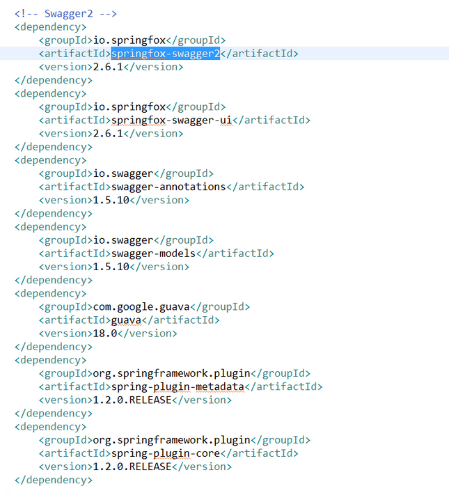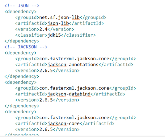 <!-- Swagger包 --> springfox-core-2.6.1 springfox-schema-2.6.1 springfox-spi-2.6.1 springfox-spring-web-2.6.1 springfox-swagger2-2.6.1 springfox-swagger-common-2.6.1 springfox-swagger-ui-2.6.1 swagger-models-1.5.10 swagger-annotations-1.5.10 spring-plugin-metadata-1.2.0.RELEASE spring-plugin-core-1.2.0.RELEASE classmate-1.2.0 guava-18.0 mapstruct-1.0.0.Final <!-- JSON包 --> json-lib-2.4-jdk15 json-lib-2.4-sources <!-- JACKSON包 --> jackson-annotations 2.6.5 jackson-databind 2.6.5 jackson-core 2.6.5