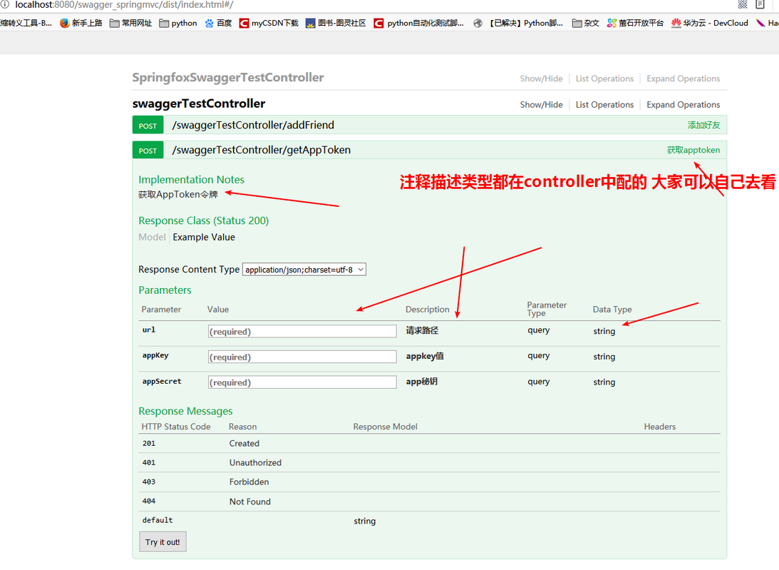 通过输入http://localhost:8080/项目跟路径/swagger-ui.html直接可以访问自己的页面。我的是http://localhost:8080/springfox_springmvc/swagger-ui.html