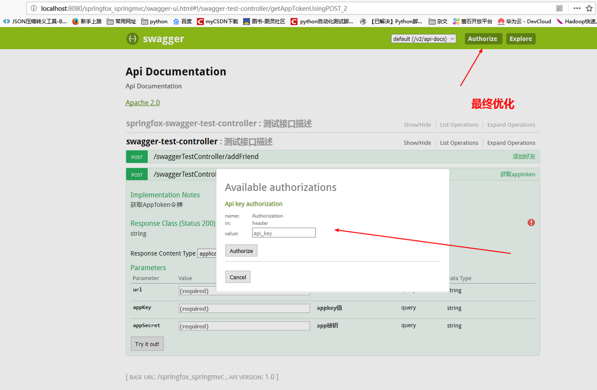 设置完成后进入SwaggerUI,右上角出现“Authorization”按钮,点击即可输入我们配置的参数。