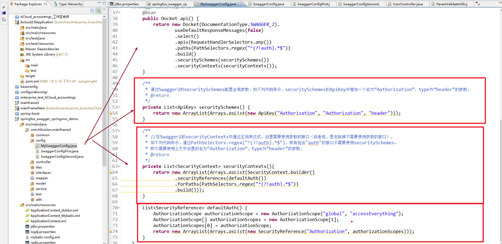 通过Swagger2的securitySchemes配置全局参数:如下列代码所示,securitySchemes的ApiKey中增加一个名为“Authorization”,type为“header”的参数。