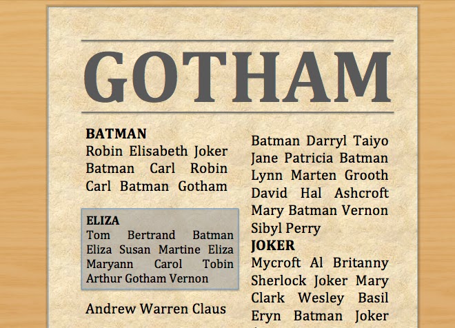 All text in the newspaper is arranged in text blocks. A text block is ultimately made up of nothing but names, and it may have a headline, but does not have to. Headlines are printed in bold face, and consist of a single name. All occurrences of that name within the text belonging to the headline arefamous, that is, they refer to that headline person. All names that are not headline material areordinary. Text blocks may contain other text blocks, including their headings (which work like sub-headings, or sub-sub-headings and so on). Thus, a name may be ordinary in one sub-text, but in another, it may be made famous by the headline of that sub-text.