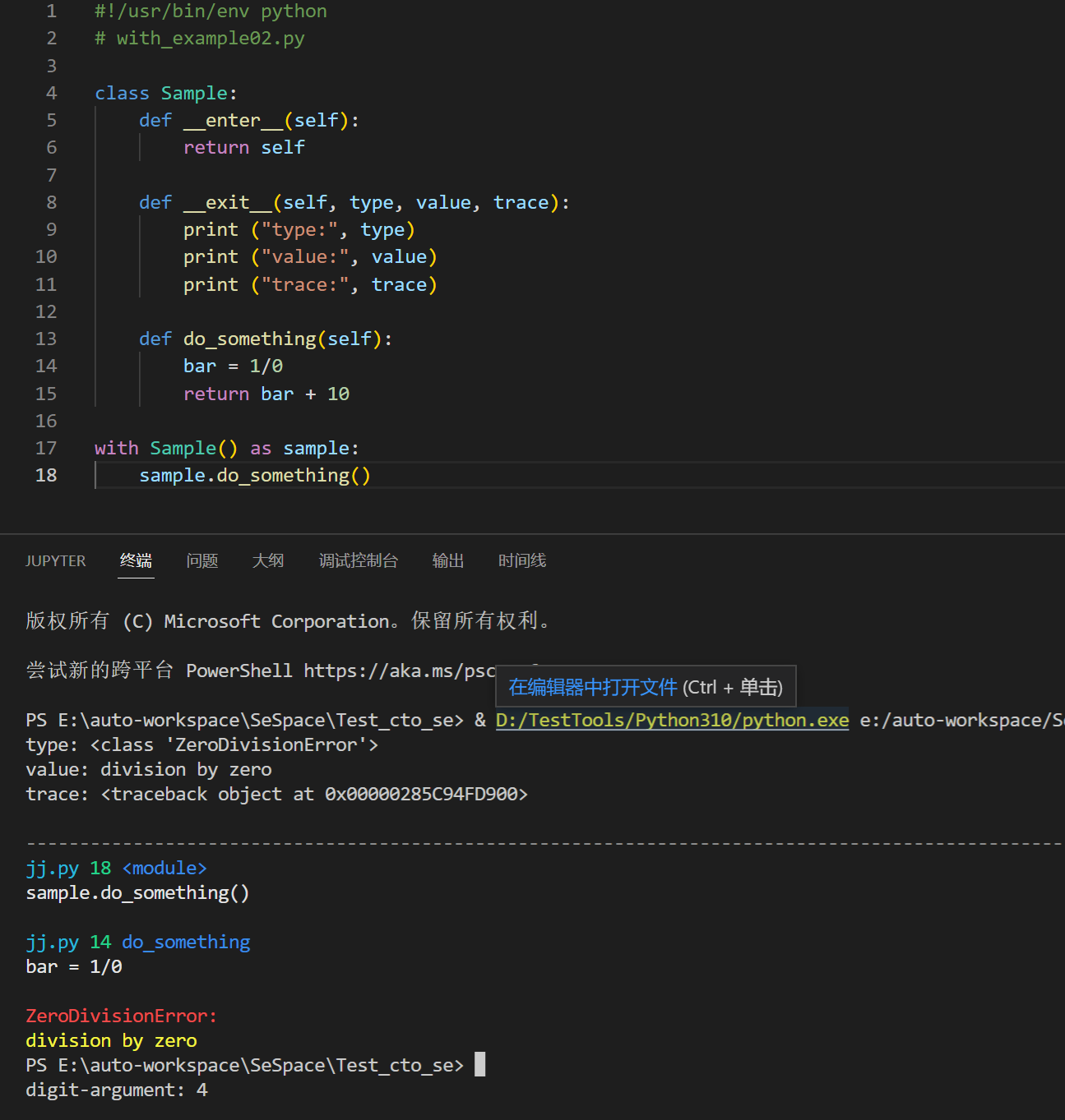 #!/usr/bin/env python # with_example02.py class Sample: def __enter__(self): return self def __exit__(self, type, value, trace): print ("type:", type) print ("value:", value) print ("trace:", trace) def do_something(self): bar = 1/0 return bar + 10 with Sample() as sample: sample.do_something()