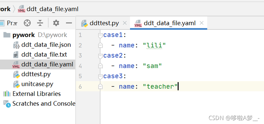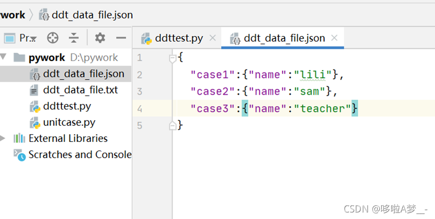 1、新建一个文件,如:ddt_data_file.json,也可以是yaml文件,使用yaml文件需要安装yaml: pip install pyyaml