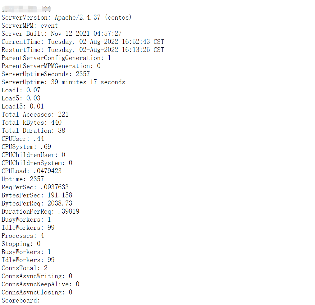 1.5,在浏览器中访问:http://serverip/server-status 或 http://serverip/server-status?refresh=N(刷新时间) 或 http://serverip/server-status/auto(简单的状态表格)