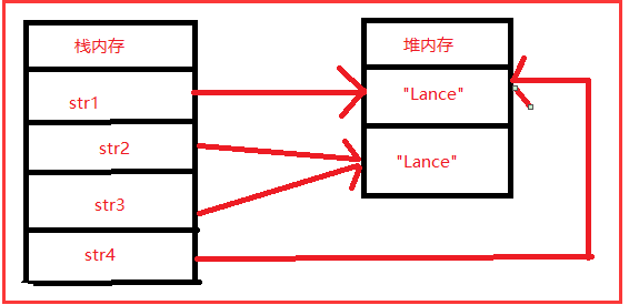 public class TestString { public static void main(String[] args) { String str1 = "Lance"; String str2 = new String("Lance"); String str3 = str2; //引用传递,str3直接指向st2的堆内存地址 String str4 = "Lance"; /** * ==: * 基本数据类型:比较的是基本数据类型的值是否相同 * 引用数据类型:比较的是引用数据类型的地址值是否相同 * 所以在这里的话:String类对象==比较,比较的是地址,而不是内容 */ System.out.println(str1==str2);//false System.out.println(str1==str3);//false System.out.println(str3==str2);//true System.out.println(str1==str4);//true } }