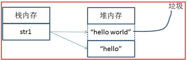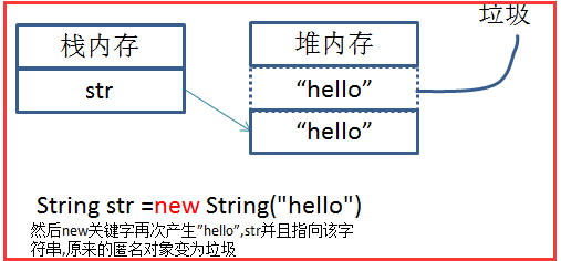 2)构造方法(String str= new String("hello");):会开辟两块堆内存空间,其中一块堆内存会变成垃圾被系统回收,而且不能够自动入池,