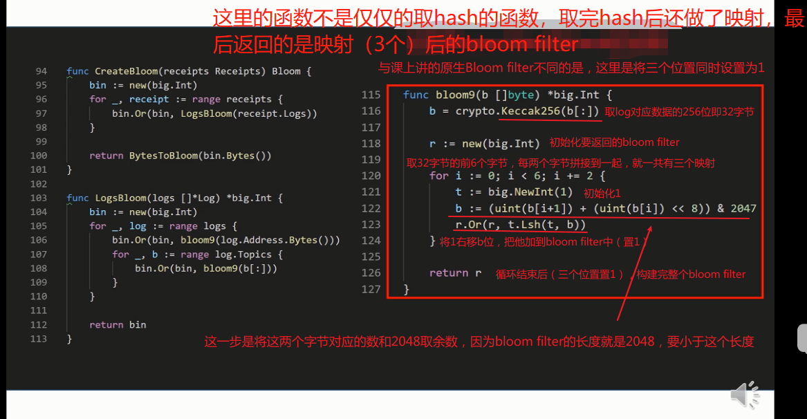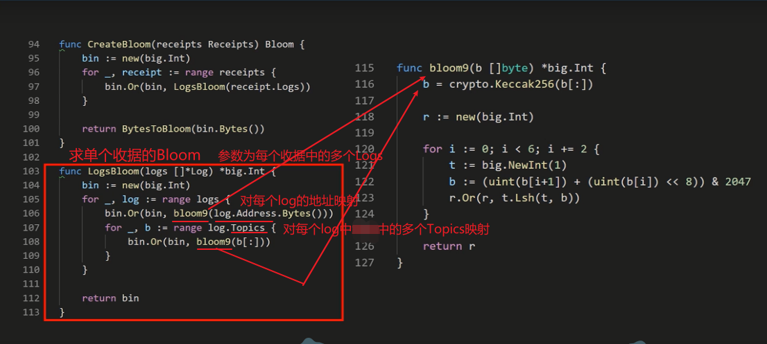 每个交易完成后会产生一个收据,收据包含一个Bloom filter记录交易类型、地址等信息。在区块block header中也包含一个Bloom filter,其为该区块中所有交易的Bloom filter的一个并集。