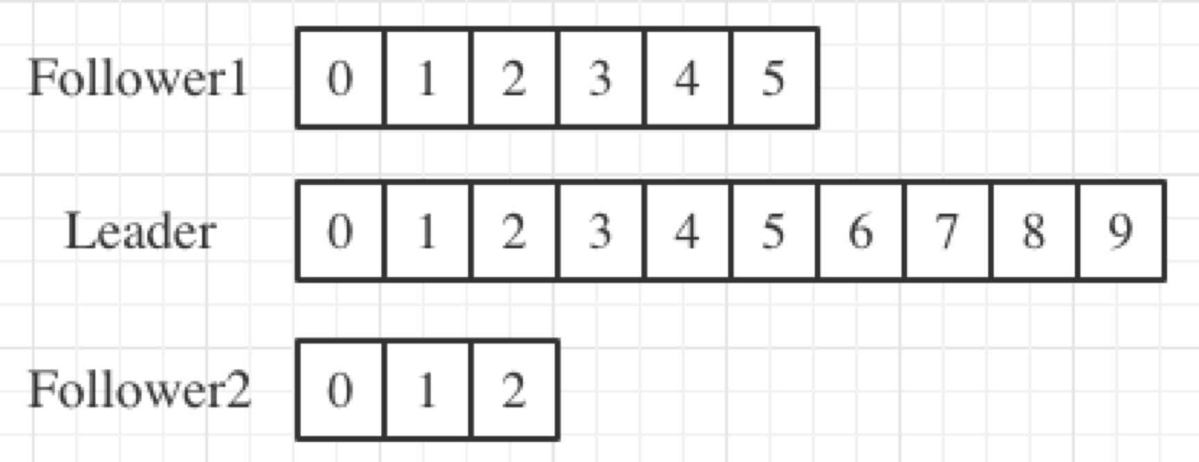 图中有 3 个副本:1 个领导者副本和 2 个追随者副本。Leader 副本当前写入了 10 条消息,Follower1 副本同步了其中的 6 条消息,而 Follower2 副本只同步了其中的 3 条消息。
