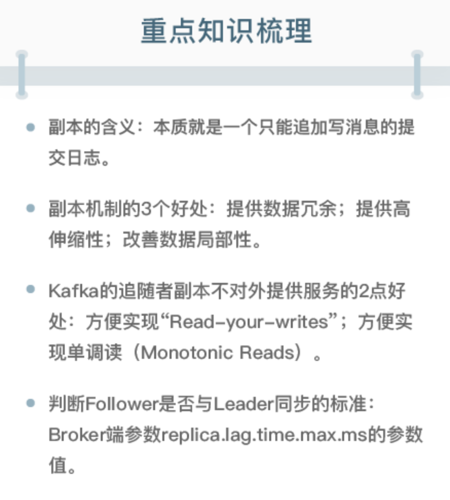 因为有多个副本,副本同步又是异步的,Kafka 要明确地告诉我们,追随者副本到底在什么条件下才算与 Leader 同步,所以提出一个概念:In-sync Replicas(ISR)。