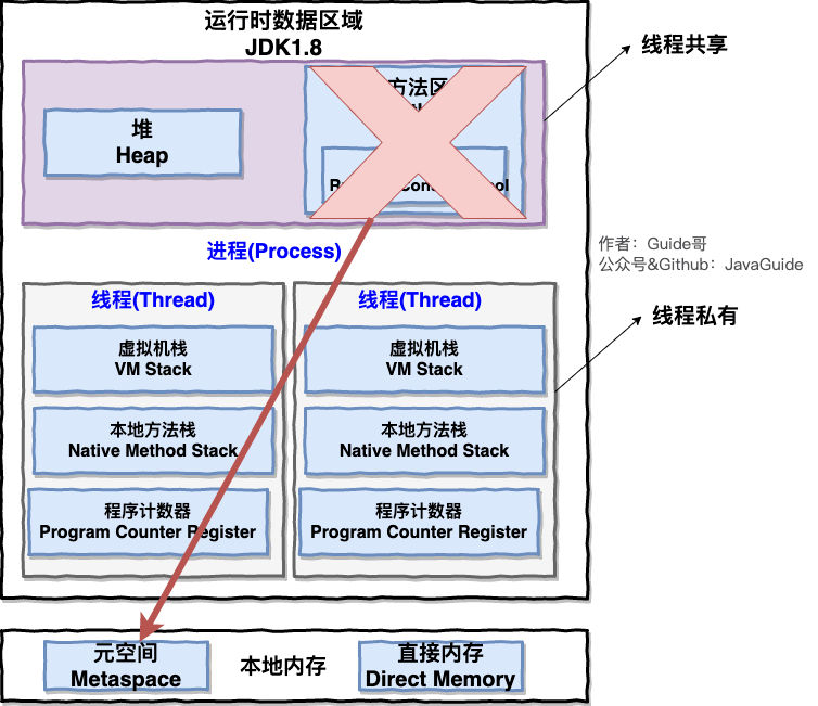 图片这X掉的是方法区,方法区是JVM的规范,大家可能会搞混永久代和方法区,其实永久代就是Jdk 1.8以前 HotSpot对方法区的实现。