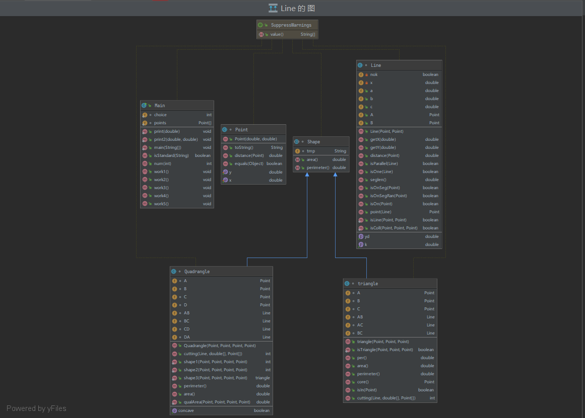 线类的构造方法需要两个点(两点组成一条线),前提是两点不能重复,所以需要在创建Line对象时进行判断两点是否相同,如若相同就不可以创建对象;线的属性有组成该线的两个点A和B(该线类不仅可以表达直线,也可以表示一条线段),组成一条直线的各个参数(这里推荐使用直线的一般式ax+by+c=0来表示直线,可以避免很多情况的讨论)a,b,c,由于我一开始使用的是y=kx+b来表示,需要对x=k这一斜率不存在的直线单独考虑,出现了很多错误,后续更改为一般式的时候,也没有完全作废掉原来的,所以我的Line类有些冗余,里面还保留了k(斜率),nok(表示斜率是否存在),x(就是斜率不存在时,x=k里面的k),特此提醒;线的方法可以很丰富,甚至在后续三角形、四边形等类中为了方便其设计,还要在Line类里面添加新的方法,所以,方法这一块可以很多,这里只列举几个常用的方法getX(double y)和getY(double x),给定x(或者y),来求直线上改点对应的y(或者x), distance(Point p)求直线到p点的距离,isParallel(Line line)该直线是否与line直线平行,isOne(Line line)该直线是否与line直线是同一条直线,seglen()返回该线段的长度,isOnSeg(Point p)p点是否处于该线段上,isOn(Point p)p点是否处于该直线上,Point point(Line line)求两直线交点。
