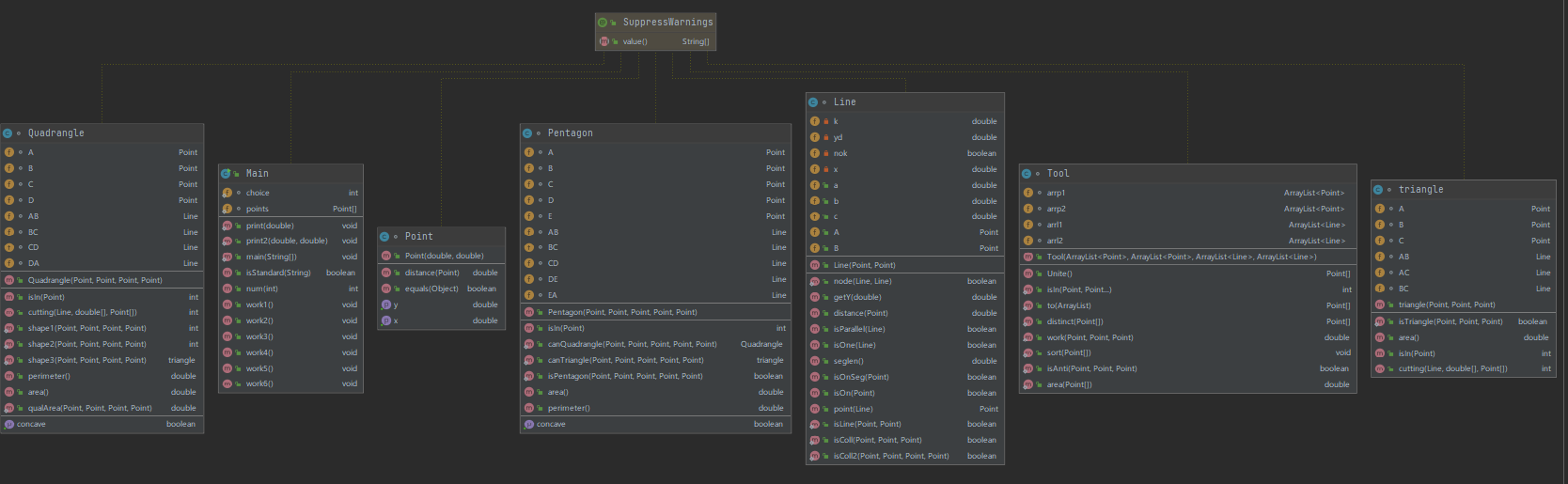 作业五:本次作业作为“多边形系列”的最终篇,可以说也是坑很多,非常考验同学对类的设计能力,如果之前的三角形类和四边形类没有设计好的话,做起来可以说很困难,所以想要“舒服”地搞定这道题,还是要稳扎稳打,从点到线到三角形到四边形,每一个类都要设计的很有逻辑。