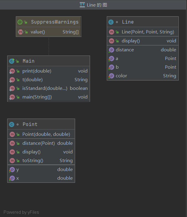1 class Point { 2 3 private double x; 4 private double y; 5 6 public Point(double x, double y) { 7 this.x = x; 8 this.y = y; 9 } 10 11 public double distance(Point point) { 12 13 return Math.sqrt((x - point.x) * (x - point.x) + (y - point.y) * (y - point.y)); 14 } 15 16 public double getX() { 17 return x; 18 } 19 20 public void setX(double x) { 21 this.x = x; 22 } 23 24 public double getY() { 25 return y; 26 } 27 28 public void setY(double y) { 29 this.y = y; 30 } 31 32 public void display() { 33 System.out.println(this); 34 } 35 36 @Override 37 public String toString() { 38 return "(" + Main.t(this.x) + "," + Main.t(this.y) + ")"; 39 } 40 } 41 42 43 class Line { 44 45 private Point A; 46 private Point B; 47 private String color; 48 49 public Line(Point a, Point b, String color) { 50 A = a; 51 B = b; 52 this.color = color; 53 } 54 55 public double getDistance() { 56 return A.distance(B); 57 } 58 59 public void display() { 60 61 System.out.println("The line's color is:" + this.color); 62 System.out.println("The line's begin point's Coordinate is:"); 63 System.out.println(this.A); 64 System.out.println("The line's end point's Coordinate is:"); 65 System.out.println(this.B); 66 System.out.print("The line's length is:"); 67 Main.print(this.getDistance()); 68 } 69 70 public Point getA() { 71 return A; 72 } 73 74 public void setA(Point a) { 75 A = a; 76 } 77 78 public Point getB() { 79 return B; 80 } 81 82 public void setB(Point b) { 83 B = b; 84 } 85 86 public String getColor() { 87 return color; 88 } 89 90 public void setColor(String color) { 91 this.color = color; 92 } 93 }