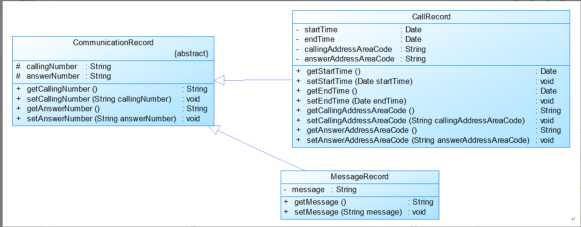 1 abstract class CommunicationRecord { 2 protected String callingNumber; 3 protected String answerNumbe; 4 5 public String getCallingNumber() { 6 return callingNumber; 7 } 8 9 public void setCallingNumber(String callingNumber) { 10 this.callingNumber = callingNumber; 11 } 12 13 public String getAnswerNumbe() { 14 return answerNumbe; 15 } 16 17 public void setAnswerNumbe(String answerNumbe) { 18 this.answerNumbe = answerNumbe; 19 } 20 21 }