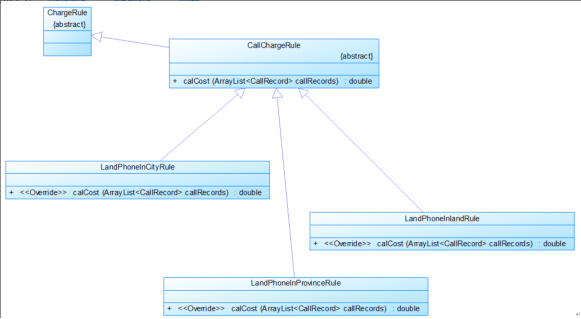 1 class LandPhoneInCityRule extends CallChargeRule { 2 3 @Override 4 public double calCost(UserRecords userRecords) { 5 double sumCost = 0; 6 for (CallRecord call : userRecords.getCallingInCityRecords()) { 7 double distanceS = (-call.getStartTime().getTime() + call.getEndTime().getTime()) / 1000; 8 if (distanceS < 0) { 9 continue; 10 } 11 double distanceM = (int) distanceS / 60; 12 if (distanceS % 60 != 0) { 13 distanceM += 1; 14 } 15 if (call.getCallType().equals("11")) { 16 sumCost += distanceM * 0.1; 17 } else if (call.getCallType().equals("12")) { 18 sumCost += distanceM * 0.3; 19 } else if (call.getCallType().equals("13")) { 20 sumCost += distanceM * 0.6; 21 } 22 } 23 return sumCost; 24 } 25 26 } 27 28 class LandPhoneInlandRule extends CallChargeRule { 29 30 @Override 31 public double calCost(UserRecords userRecords) { 32 double sumCost = 0; 33 for (CallRecord call : userRecords.getCallingInLandRecords()) { 34 double distanceS = (-call.getStartTime().getTime() + call.getEndTime().getTime()) / 1000; 35 if (distanceS < 0) { 36 continue; 37 } 38 double distanceM = (int) distanceS / 60; 39 if (distanceS % 60 != 0) { 40 distanceM += 1; 41 } 42 sumCost += distanceM * 0.6; 43 } 44 return sumCost; 45 } 46 47 } 48 49 class LandPhoneInProvinceRule extends CallChargeRule { 50 51 @Override 52 public double calCost(UserRecords userRecords) { 53 double sumCost = 0; 54 for (CallRecord call : userRecords.getCallingInProvinceRecords()) { 55 double distanceS = (-call.getStartTime().getTime() + call.getEndTime().getTime()) / 1000; 56 if (distanceS < 0) { 57 continue; 58 } 59 double distanceM = (int) distanceS / 60; 60 if (distanceS % 60 != 0) { 61 distanceM += 1; 62 } 63 sumCost += distanceM * 0.3; 64 } 65 return sumCost; 66 } 67 68 }