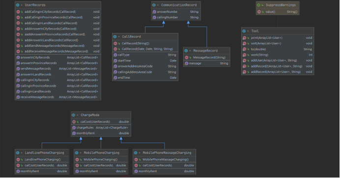 作业六:作为电信计费系列的“开篇”,本题能否准确理解类图、完美解决问题很大程度影响了后续两次作业能否顺利完成,后面两次作业都会在作业六上面进行修改并添加内容。题目难度上较为简单,情况比较单一,难点在于正确创建类。