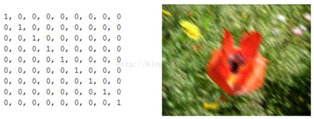 运动模糊可以通过只在一个方向模糊达到,例如下面9x9的运动模糊滤波器。注意,求和结果要除以9。