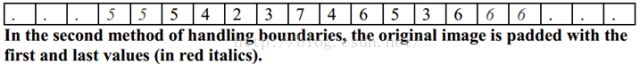 2)第二种方法也是想象I是无限图像的一部分。但没有指定的部分是用图像边界的值进行拓展。在我们的例子中,因为图像I最左边的值I(1)=5,所以它左边的所有值,我们都认为是5 。而图像右边的所有的值,我们都认为和右边界的值I(10)一样,都是6。这时候J(1) = (I(0) + I(1) + I(2))/3 = (5 + 5 + 4)/3= 14/3. 而J(10) = (I(9)+I(10)+I(11))/3 = (3 + 6 + 6)/3 = 5。