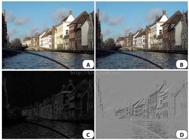 A:原图像。B:锐化。C:边缘检测。D:浮雕