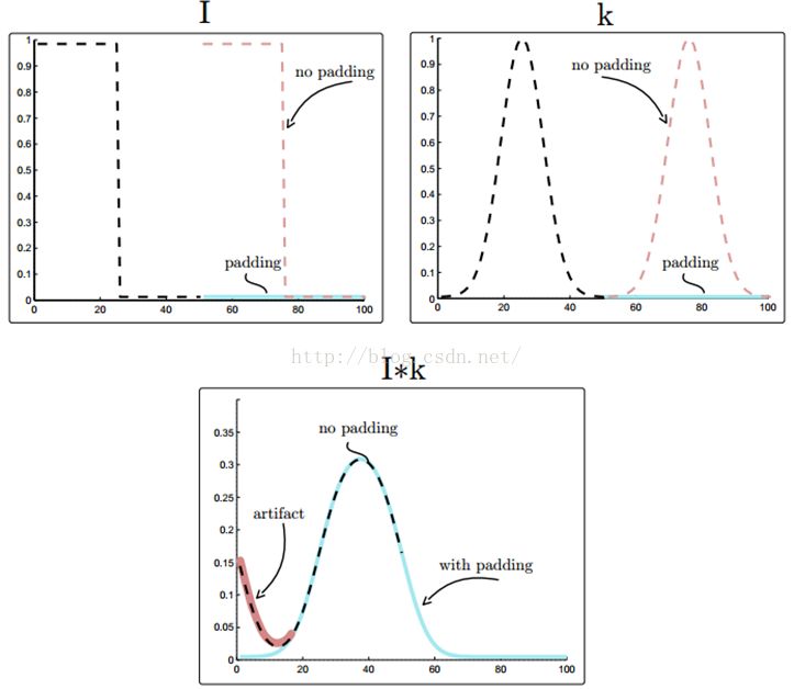 如上图,对于I和K,如果没有padding的话,隐含着会假定I和K是周期的,以他们的长度N为周期。图中本来N长度的I和K都是黑色虚线的部分,然后如果没有padding,隐含着就会在N之外,加上同样的无数个I,如红色虚线部分,加上了一个周期。对K也是这样。如果是zero padding的话,在黑色虚线的其他地方都全是0了,如图中蓝色部分。将I和K卷积,如果没有padding,如黑色虚线,会有红色那部分的artifact。如果有padding,就是蓝色实线。