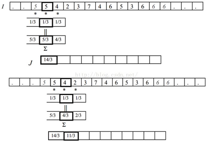 我们在1D图像中,用每个像素和它的二邻域的平均值来取代它的值。假设我们有个1D的图像I是这样的: