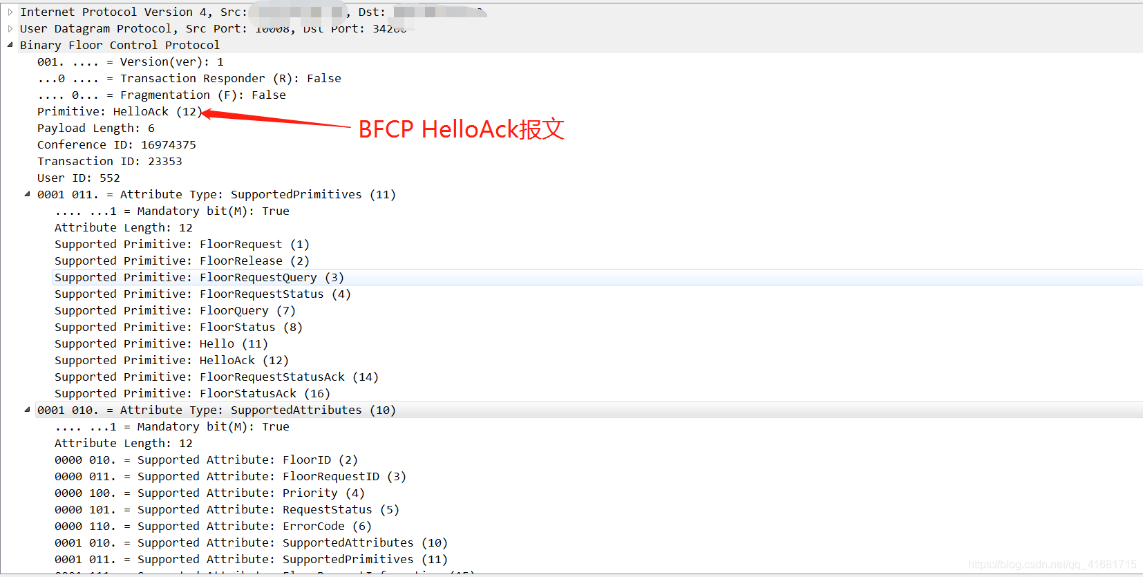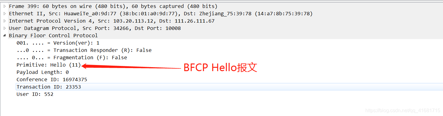 BFCP客户端和服务端连接后,需要发送Hello握手报文,接收端收到报文后,回复HelloAck报文,表示BFCP握手成功,握手交互报文如下: