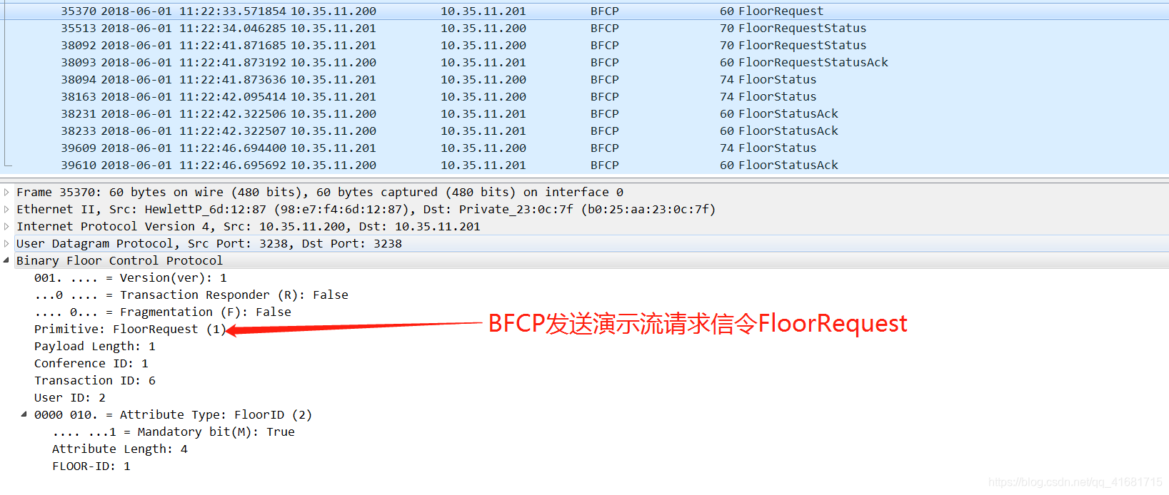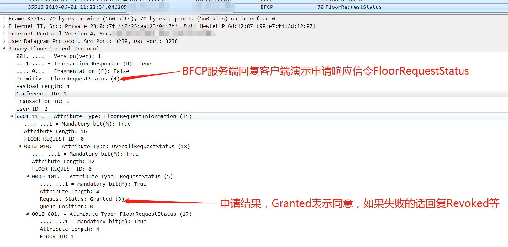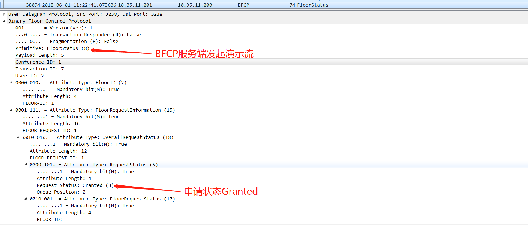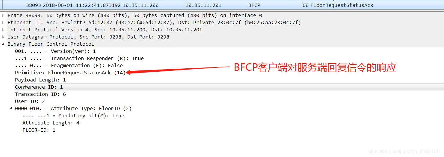 需要特别注意:客户端发送报文中的User ID、Conference ID和Floor ID字段需要携带上服务端SDP中声明的相关字段的值,否则遇到判断比较严格的厂家,BFCP客户端发送的报文,服务端会不响应或者回复拒绝的报文,携带上相关的错误原因及错误码。