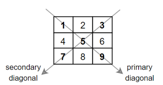 逐行遍历,记当前的行号为 i,则当前行中处于对角线的元素为: 坐标 (i,i) 和坐标 (i,n−i−1),因此我们把 (i,i) 与 (i,n−i−1) 处的数字加入到答案中。