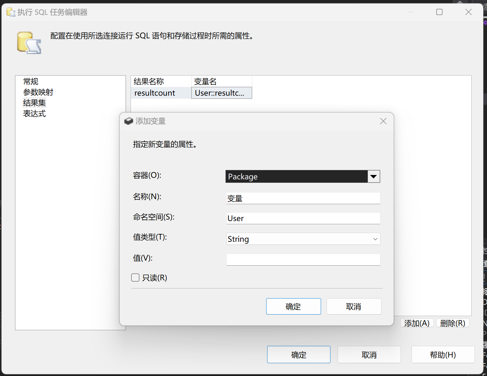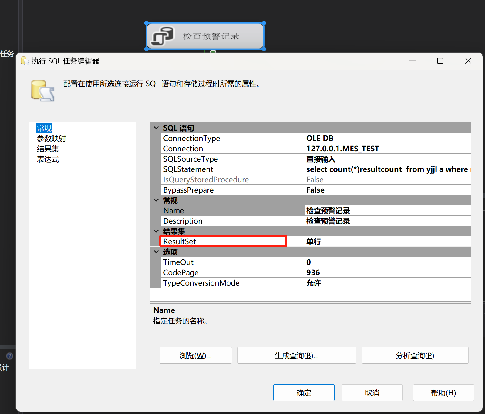 情况1:在配置控制流时,想在数据流前面进行数据的过滤或者是前置的数据记录数的判断,那可以在数据流前面增加SQL执行任务用来放置判断SQL语句,随后得在SQL执行任务编辑界面找到ResultSet(结果集),在右侧下拉选择项中选择单行(这里选择单行是因为写的SQL判断语句只输出一行值)