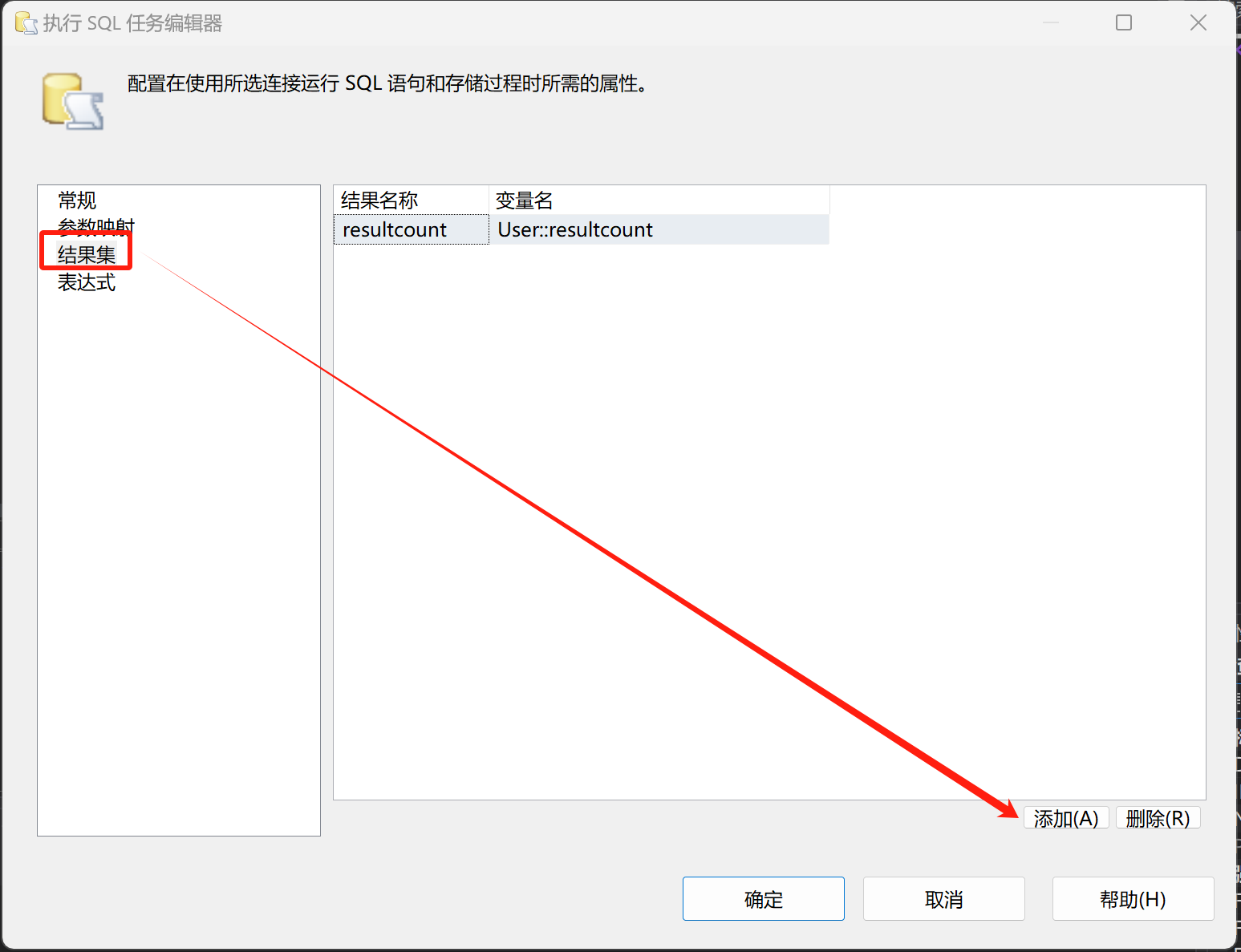 随后在左侧菜单栏里选择结果集,在该界面添加结果集,点击添加后会新增一个默认值的结果集,名称可修改(名称与放置的sql语句中对应字段别名一致),新增变量,这里容器默认就行,然后变量名称可修改,以及对应的类型根据实际sql执行任务输出的值进行设定。