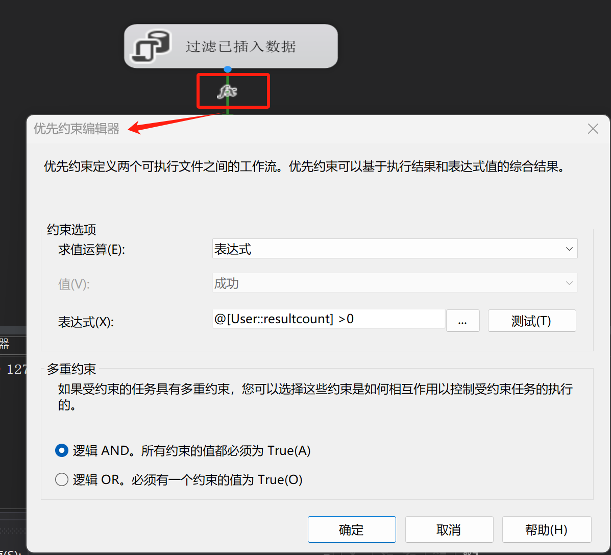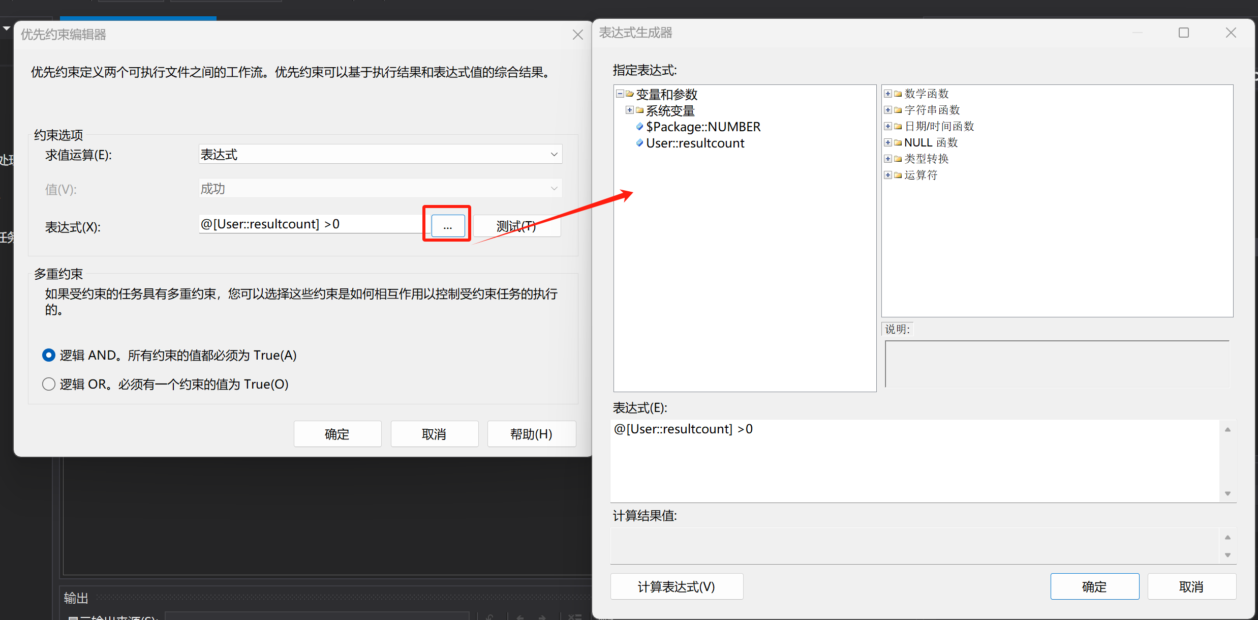 结果集配置完成后,进行约束创建,可以直接双击任务连接线进入优先约束编辑界面,选择约束类型,这里我是选择表达式,然后设置表达式,可直接点击右侧按钮进入表达式编辑界面,设置完表达式后记得计算下表达式进行验证。(变量以及运算公式可拖拽)