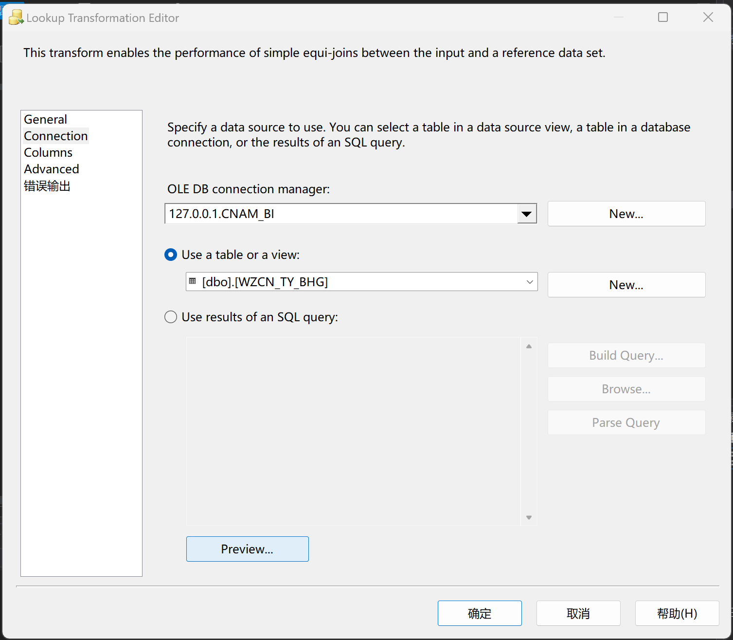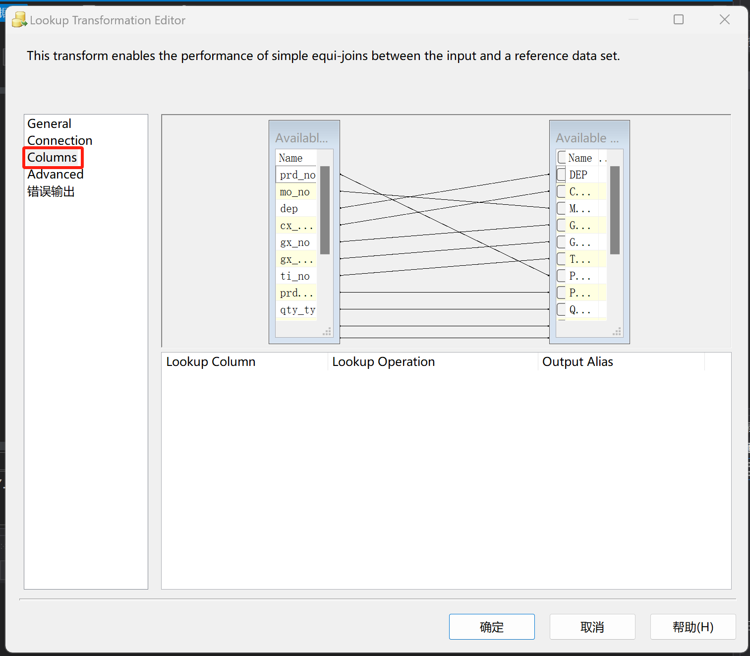 情况2:在配置数据流时,想要实现增量抽取,需要在数据源中间增加查询任务(在SSIS工具箱中找到查找并拖拽到数据流中),然后将查找任务与输出源以及目标源进行连接,然后双击查找任务进入编辑界面,先设置好常规设置,第一个缓存方式选择全缓存,第二个数据连接类型选择OLE DB(sql server),第三输出方式选择无匹配输出;常规设置完后,配置数据库连接,然后点击columns进行字段匹配,这样就基本配置完成了。