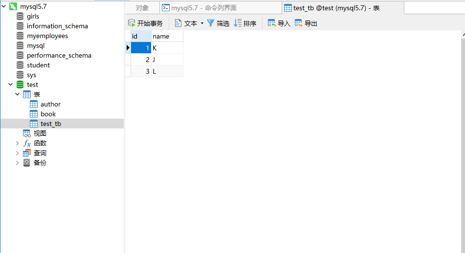INSERT INTO test_tb VALUES(1,"K"),(2,"J"),(3,"L");
