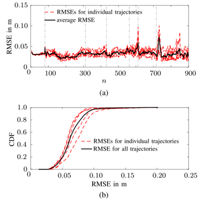 图 6(a) 显示了针对五个轨迹单独获得的 BP-SLAM 代理位置 RMSE 随时间 n 的变化,以及在五个轨迹上平均的整体 RMSE。图 6(b) 显示了单个 RMSE 的经验累积分布函数 (CDF) 和五个 RMSE 的经验累积分布函数。可以看出,在 RMSE 等于 0.12m 甚至更小时,各个 CDF 已经非常接近 1。所有单个 RMSE 的最大值在所有情况下都低于 0.2m,在所有情况下的 90% 都低于 0.083m。