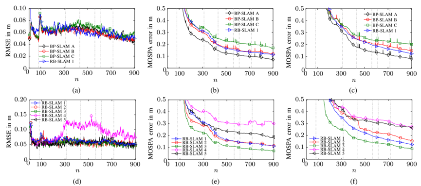 图 5 显示了估计代理位置的 RMSE 和两个 PAs 和相关 VAs 的 MOSPA 误差。对于 BP-SLAM,我们考虑了三种不同的参数设置,称为 BP-SLAM A-C,其中每个后验状态 pdf(对于代理状态、每个遗留 PF 状态和每个新 PF 状态)由 50.000(BP- SLAM A)、10.000(BP-SLAM B)或 5.000(BP-SLAM C)粒子。对于 RB-SLAM,考虑了五种不同的参数设置,称为 RB-SLAM 1-5,其中代理状态的后验 pdf 和每个特征状态的后验 pdf 分别由 50 和 10.000 表示(RB-SLAM 1)、100 和 5.000 (RB-SLAM 2)、100 和 10.000 (RB-SLAM 3)、500 和 1.000 (RB-SLAM 4),或 1.000 和 1.000 (RB-SLAM 5) 粒子。在图 5(a)中,可以看出使用 BP-SLAM A-C 和 RB-SLAM 1 获得的代理位置 RMSE 通常非常相似。另一方面,图 5(b) 和 (c) 表明,正如所料,BP-SLAM 的 MOSPA 误差对于更多的粒子来说更小。RB-SLAM 1 的 MOSPA 误差仅略小于 BP-SLAM B(这是比较的良好基础,因为 RB-SLAM 1 也为每个特征状态使用 10.000 个粒子)。鉴于 BP-SLAM 假定代理状态和所有特征状态的先验独立性这一事实,这是值得注意的。 BP-SLAM A 甚至比 RB-SLAM 具有更小的 MOSPA 错误。图 5(d)–(f)比较不同RB-SLAM参数设置的RMSE和MOSPA误差结果;现在将讨论这些结果。