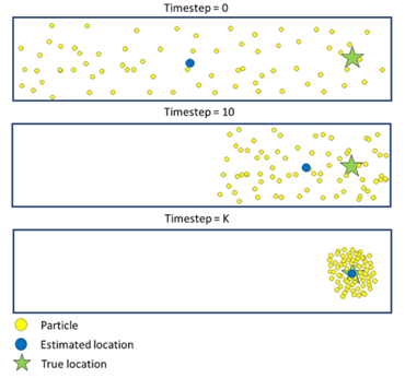 图7 PF算法的图示。粒子在时间步长 = 0 时初始化。在每个时间步长,状态接近目标真实状态的粒子更有可能被重新采样,直到它们在某个时间步长 = K 收敛