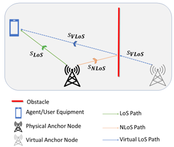VAN 在 UE 和 PAN(也称为接入节点)的定位中起着决定性的作用。当 UE 和 PAN 之间没有障碍物时,存在 LoS 通信。在这种情况下,计算 PAN 的范围很简单,因为接收信号中没有多径传播延迟。另一方面,在 NLoS 场景中,信号在到达目的节点之前经过许多障碍物被散射和反射。此外,该接收信号由传播延迟和多径延迟组成。多路径延迟由各种反射表面引起,并导致在接收器端出现相同传输信号的多个副本。因此,计算此类节点的范围变得具有挑战性。为了克服这一挑战,可以使用 VAN。顾名思义,VAN是一个虚拟节点,它既不在物理上存在,也不在任何节点之间提供任何无线功能。然而,它被认为实际上存在于 PAN 的镜像位置和 LoS 障碍物后面 [44]。反射信号被视为来自 VAN 的虚拟视距 (VLoS) 信号。 VAN 的简单图示如图 4 所示,其中 sLoS、sNLoS 和 sV LoS 分别是 UE 和 PAN 之间的 LoS、NLoS 和 VLoS 信号。此外,每个 VAN 都与来自障碍物的每个反射相关联。因此,如果障碍物的表面产生多次反射,那么每次反射都会有同样多的 VAN。 PAN 的真实位置可以通过镜像 VAN 相对于障碍物的位置来计算 [6]。