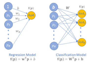 在ML中,回归是指一种预测数量连续值的方法[82]。换句话说,回归模型的输出是一个随机变量的数值。对于 AoA 估计的应用,回归模型的输出将是 AoA 的预测值。基于单层神经网络的回归模型的图示如图6所示。输入层包含由pn表示的N个特征,而wn和b分别是单层神经网络的权重和偏差。输出是表示预测 AoA 的标量值。